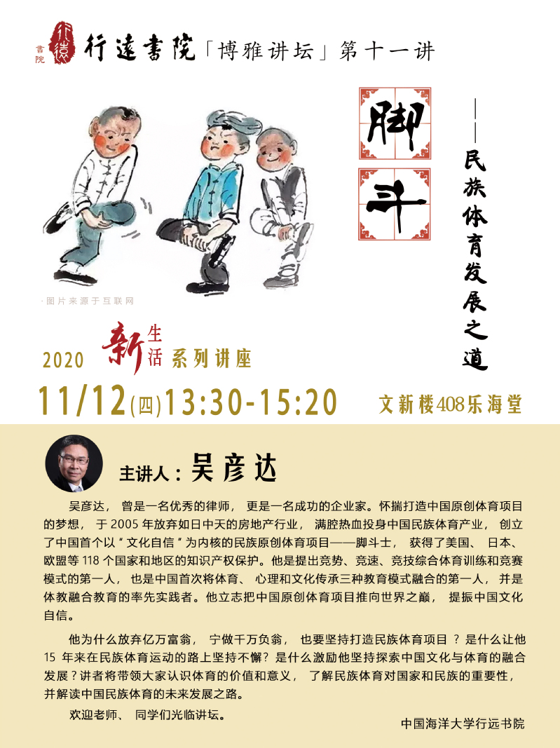 講座題目:腳斗—民族體育發展之道講座時間:2020年11月12日(周四)13:30-15:20講座地點:嶗山校區文新樓樂海堂(408)主講人:吳彥達主講人簡介:吳彥達,曾是一名優秀的律師,更是一名成功的企業家。懷揣打造中國原創體育項目的夢想,于2005年放棄如日中天的房地產行業,滿腔熱血投身中國民族體育產業,創立了中國首個以“文化自信”為內核的民族原創體育項目——腳斗士,獲得了美國、日本、歐盟等118個國家和地區的知識產權保護。他是提出競勢、競速、競技綜合體育訓練和競賽模式的第一人,也是中國首次將體育、心理和文化傳承三種教育模式融合的第一人,并是體教融合教育的率先實踐者。他立志把中國原創體育項目推向世界之巔,提振中國文化自信。講座提綱:他為什么放棄億萬富翁,寧做千萬負翁,也要堅持打造民族體育項目?是什么讓他15年來在民族體育運動的路上堅持不懈?是什么激勵他堅持探索中國文化與體育的融合發展?講者將帶領大家認識體育的價值和意義,了解民族體育對國家和民族的重要性,并解讀中國民族體育的未來發展之路。