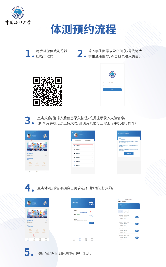 學部、各學院(中心): 按照教育部辦公廳《關于開展國家學生體質健康標準測試和落實學校體育三個辦法有關工作安排的通知》和《教育部2021年數據上報工作的通知》的文件精神要求,學校決定從2021年11月1日開始,對全校本科生進行2021年度《國家學生體質健康標準》測試。具體安排如下: 一、體質測試項目及安排 1.測試項目8項,根據測試環境分為室內項目和室外項目。 室內項目:身高、體重、肺活量、立定跳遠、坐位體前屈、引體向上(男)/1分鐘仰臥起坐(女)。 室外項目:50米、1000米(男)/800米(女)。 2.魚山校區的測試安排:不論是否選修體育課,全部進行網上預約測試(后見附圖),測試時間為2021年11月6日(周六)和11月7日(周日)。 3.嶗山校區選修體育課的同學,在體育課中按照任課教師安排進行測試。 4.嶗山校區未選體育課的同學,均采用網上預約的方式(后見附圖)。 二、預約時間 1.全部參測學生本年度體測預約時間為2021年10月25日---10月31日(截止時間:31日24:00)。 2.如遇特殊情況不能在預約時間內參加測試,補測預約時間為2021年11月15日--19日。補測信息及時關注預約程序。 三、測試時間和地點 1.測試時間:2021年11月1日—11月21日。 2.室內項目安排:周一至周五的晚上17:30---20:00,周六和周日全天8:00-20:00。 3.室外測試地點:女生50米跑和800米跑在北田徑場東看臺處集合、測試;男生50米跑和1000米跑在東田徑場,西看臺處集合、測試。 4.室內測試地點: 嶗山校區:東田徑場東看臺后門。 魚山校區:魚山校區田徑場測試室。 學生在網上選定自己的測試時間、地點后,請按時到達場地,進行測試。 四、測試要求 1.根據教育部要求,凡經醫院檢查為身體健康的學生都必須參加測試。 2.學生須根據預約時間準時到場測試,不得遲到。 3.本年度測試采取人臉識別測試,所有同學認真按照測試要求進行測試,嚴禁弄虛作假。 4.測試學生應穿便于運動的服裝,不準穿釘鞋、皮鞋和涼鞋。 5.在測試時間內,每位同學每次預約每項可最多測試2次,取最高值,測試完畢可在預約系統中實時查看測試成績。對有特殊情況(考試、病假等)未參加初測和初測成績不合格的同學,可在加強鍛煉后再預約測試。 五、補測及免測 1.學生如預約后遇特殊原因(臨時受傷、突發疾病等)不能按時測試者,在測試時間節點前可取消預約,提交免測申請或者待傷病恢復后預約補測。 2.如遇特殊天氣,室內項目正常測試,室外項目在預約系統中及時查看系統通知。 六、其他說明 1.如因某疾病或身體其他原因(如嚴重肥胖、系統功能紊亂等)不能參加劇烈運動者,請下載填寫《免于執行《國家體質健康標準》申請表》(見附件1)并于2021年10月31日12:00前,在體測預約程序中提交免測申請表和病例或者其他證明材料的清晰照片或掃描件,符合免測要求者本年度可以不參加測試(認定不記入檔案)。凡不符合免測要求未通過認定的學生,需要進行預約補測。 2.天氣日漸轉冷,希望同學們盡快預約測試,避免參加補測。 3.問題咨詢:QQ群:173109347;QQ群:661513477 4.如需醫療救助請撥打校醫院電話,嶗山校區66782120;魚山校區82032120 體育系 2021年10月24日 附件1 :免測申請表 附件2 :體測預約流程圖