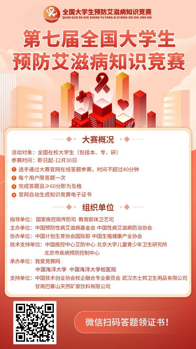 全校學生: 在第35個“世界艾滋病日”來臨之際,為貫徹落實黨中央、國務院決策部署,推進聯合國2030年終結艾滋病流行可持續發展目標的實現,實施健康中國戰略,中國預防性病艾滋病基金會按照國家衛生健康委等10部門制定的《遏制艾滋病傳播實施方案(2019-2022年)》中關于實施預防艾滋病宣傳教育工程和學生預防艾滋病教育工程的要求,為普及艾滋病防治知識,持續推進艾滋病防治宣傳教育進校園,決定于2022年10-12月聯合中國性病艾滋病防治協會主辦第七屆全國大學生預防艾滋病知識競賽。知識競賽由我校與“我愛競賽網”聯合承辦。 第七屆全國大學生預防艾滋病知識競賽采用線上網絡知識競賽與線下主題宣傳活動相結合的方式。線上答題內容包括艾滋病防治綜合、“國八條”、檢測、治療與阻斷知識及生殖健康和社會心理等方面的知識。請大家積極參加,現將線上比賽相關通知如下。 一、參賽時間 即日起至2022年12月30日。 二、參賽流程 1.掃描下方海報中的二維碼進入比賽頁面,點擊“答題入口”:通過QQ一鍵登錄官網,選擇學校(山東-中國海洋大學)、輸入姓名、聯系QQ、手機號碼、學號等信息后,正式進入答題。 2.系統將隨機從題庫中抽取50道題,其中必答題10道、艾滋病防治知識抽取22題、性與生殖健康與阻斷預防各抽取5題、檢測相關知識抽取4題、治療和社會心理知識各抽取2題。每題2分,共記100分。答題時間為40分鐘,每個用戶限答題1次,同一學校、學號不可重復答題。 3.學生完成答題后,系統自動記錄學生得分,60分以上為合格,系統自動頒發電子版《第七屆全國大學生預防艾滋病知識競賽證書》作為參賽證明。 4.2023年1月,對校內前20名同學頒發校內紙質證書和獎品,對于違規答題的將不予頒發證書和獎品,請參與同學遵守答題規則。
