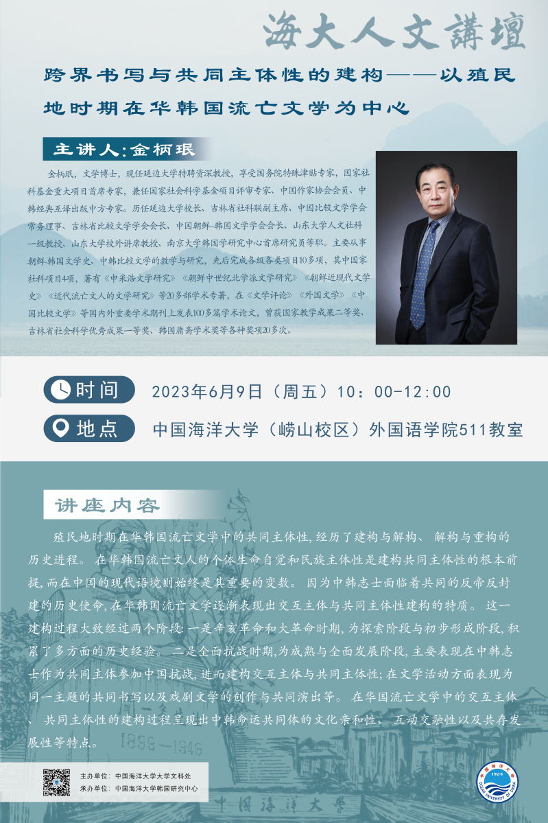 海大人文講壇2023年第39講-金柄珉:跨界書寫與共同主體性的建構——以殖民地時期在華韓國流亡文學為中心