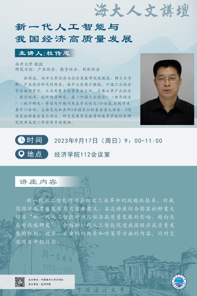 海大人文講壇2023年第62講-杜傳忠: 新一代人工智能與我國經濟高質量發展