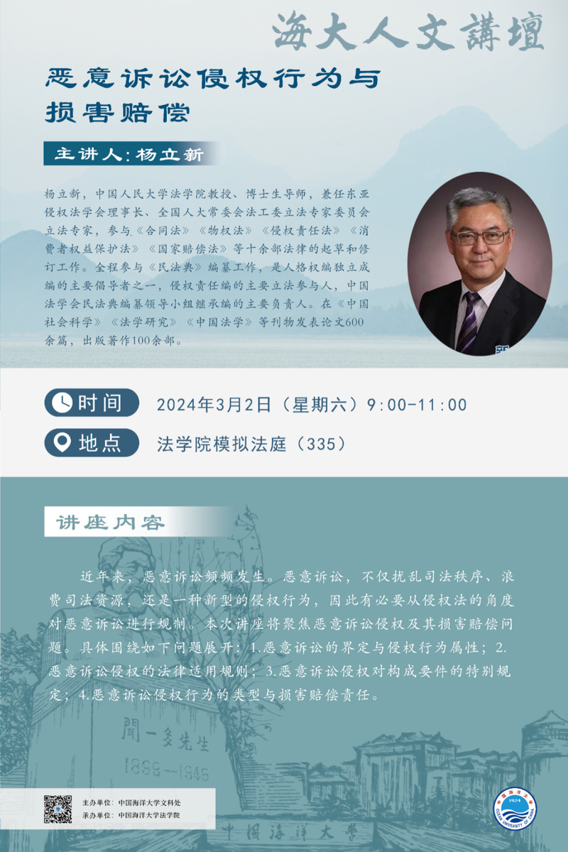 海大人文講壇2024年第5講-楊立新:惡意訴訟侵權行為與損害賠償