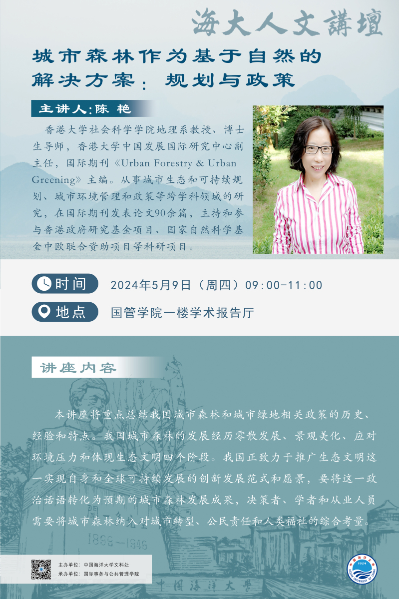 海大人文講壇2024年第22講-陳艷:城市森林作為基于自然的解決方案:規(guī)劃與政策