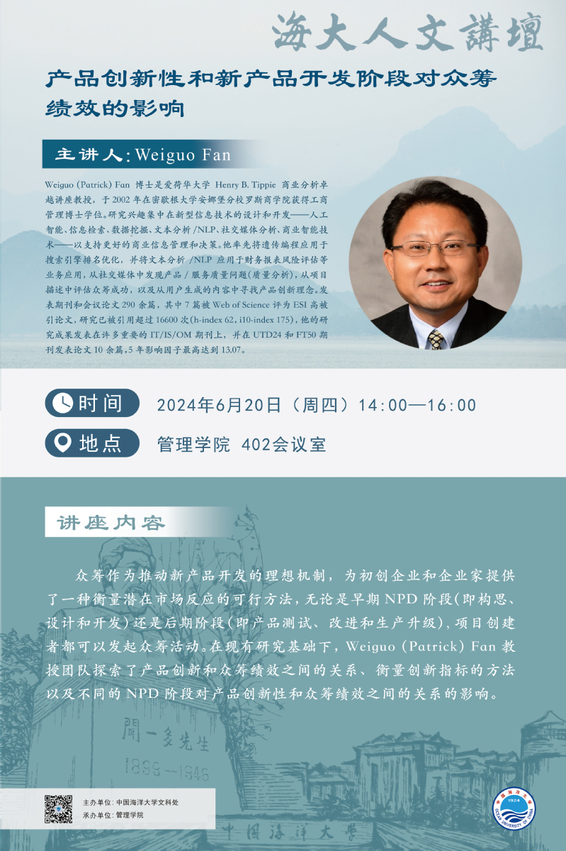 海大人文講壇2024年第46講-Weiguo Fan:產品創新性和新產品開發階段對眾籌績效的影響