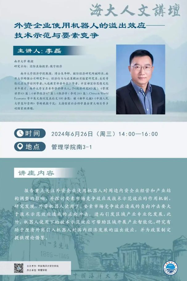 海大人文講壇2024年第53講-李磊:外資企業使用機器人的溢出效應—技術示范與要素競爭