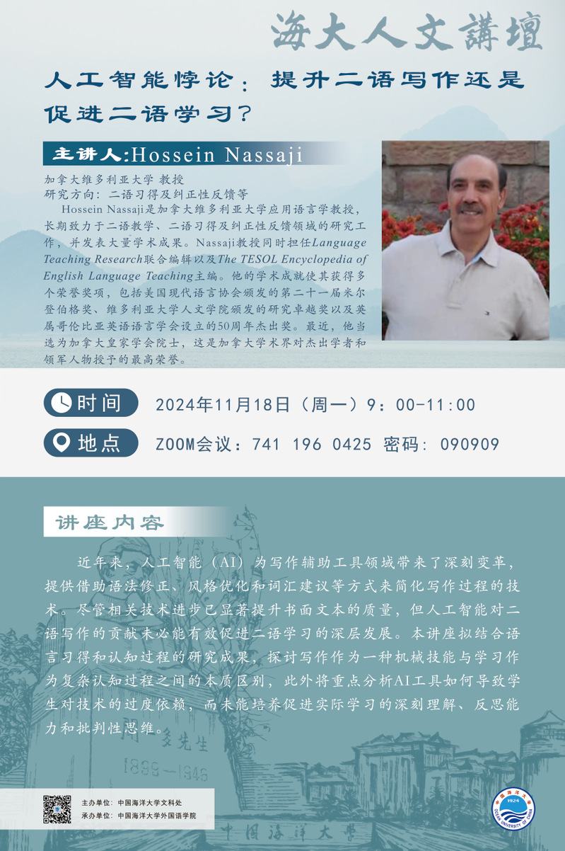 海大人文講壇2024年第86講-Hossein Nassaji:人工智能悖論:提升二語寫作還是促進二語學習?