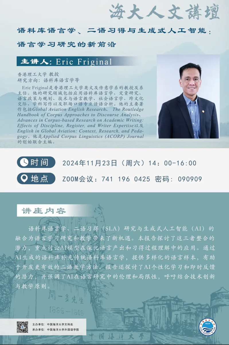 海大人文講壇2024年第91講-Eric Friginal:語(yǔ)料庫(kù)語(yǔ)言學(xué)、二語(yǔ)習(xí)得與生成式人工智能:語(yǔ)言學(xué)習(xí)研究的新前沿