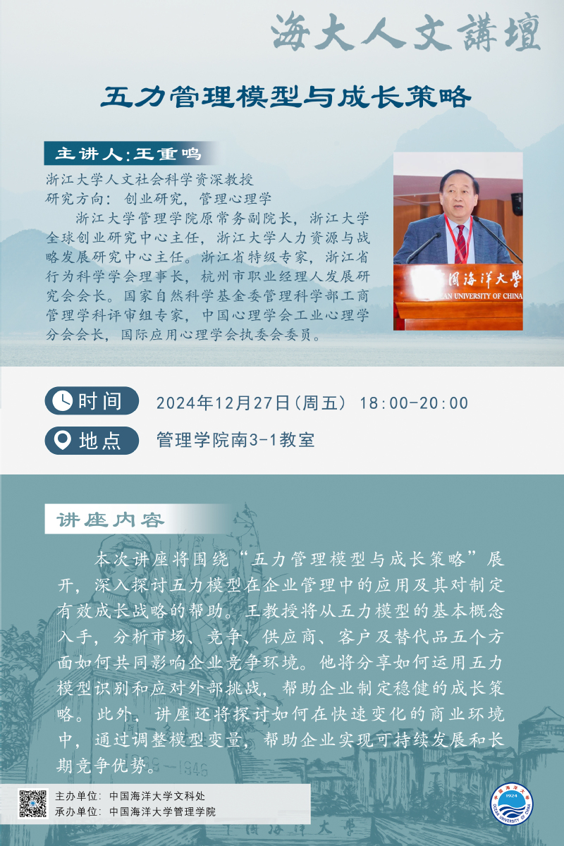 海大人文講壇2024年第102講-王重鳴:五力管理模型與成長策略