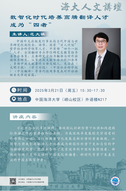 海大人文講壇2025年第8講-范大祺:數智化時代培養高端翻譯人才成為“四者”