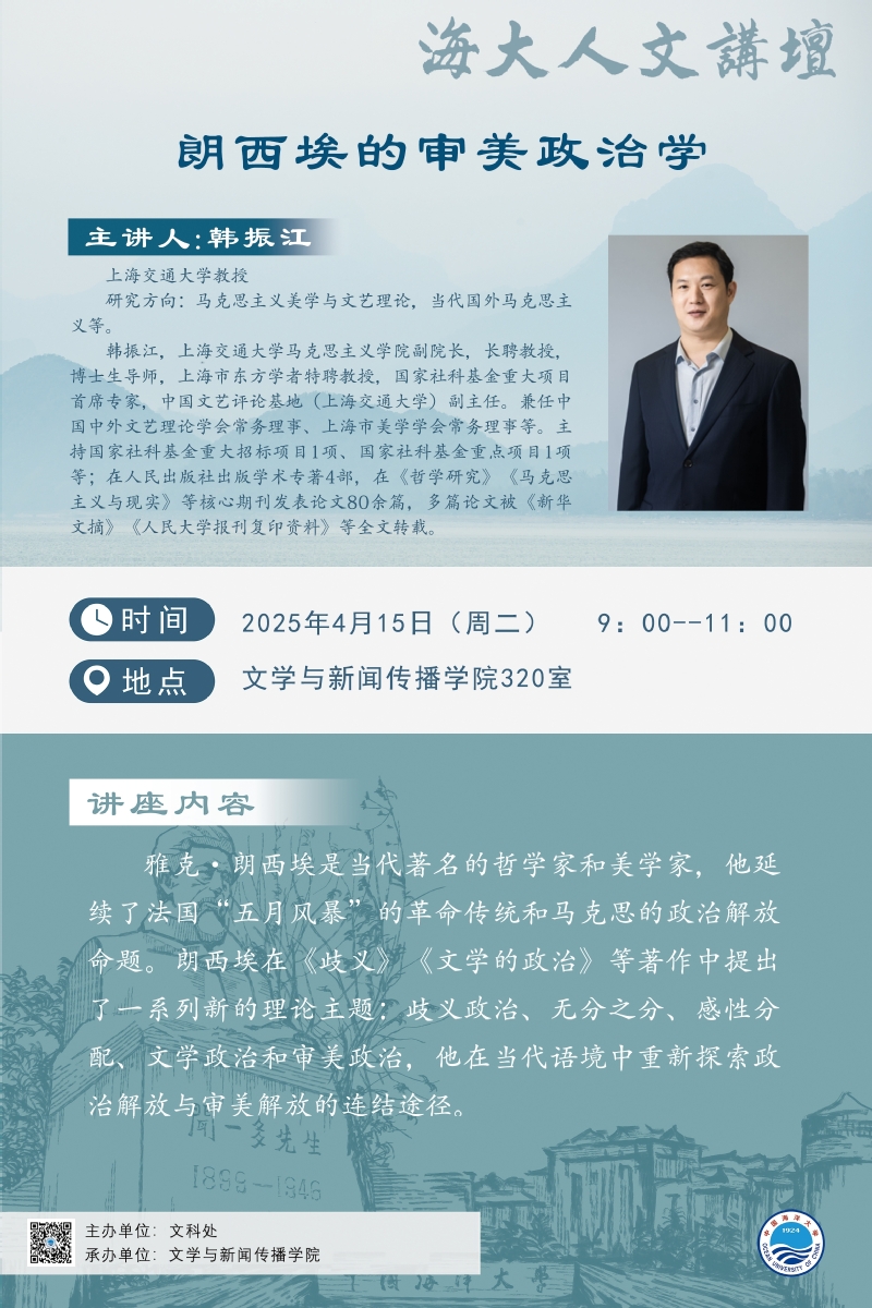海大人文講壇2025年第20講-韓振江:朗西埃的審美政治學