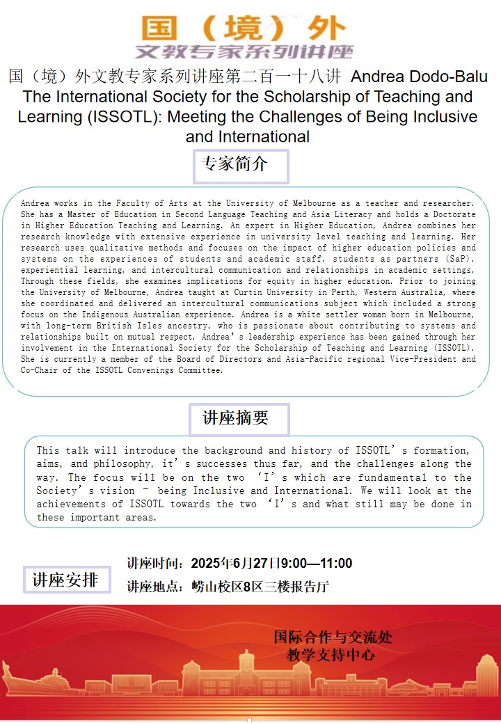 國(境)外文教專家系列講座第二百一十八講-Andrea Dodo-Balu:The International Society for the Scholarship of Teaching and Learning (ISSOTL): Meeting the Challenges of Being Inclusive and International